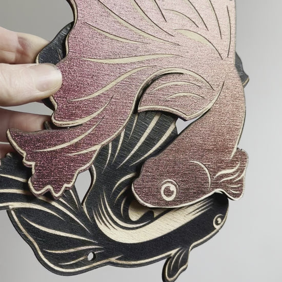 Add a splash of color and shimmer to your space with our Betta Fish Color-Shift Garland. Featuring three stunning betta fish coated in color-shifting paint and strung along an antique gold chain, this garland will make a unique and playful statement in any room. (No fish were harmed in the making of this garland!)