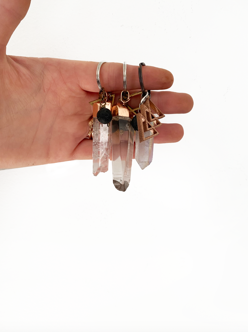 Aura Quartz Set: The aura quartz set is dipped in gold, has an antique copper keyring, and a rose gold wooden charm. The lava bead is the same on both.