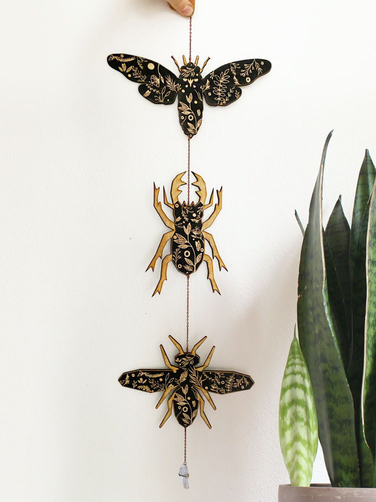 Our specialized floral insect wall hanging is the perfect addition to your home, or a gift to give. This is crafted from 1/8th inch birch wood, and has exquisite floral engraving on the front of each bug. Each insect is held together by antique copper chain. The top has a large jump loop for easy hanging, in addition to an extra chain at the bottom for added crystals.