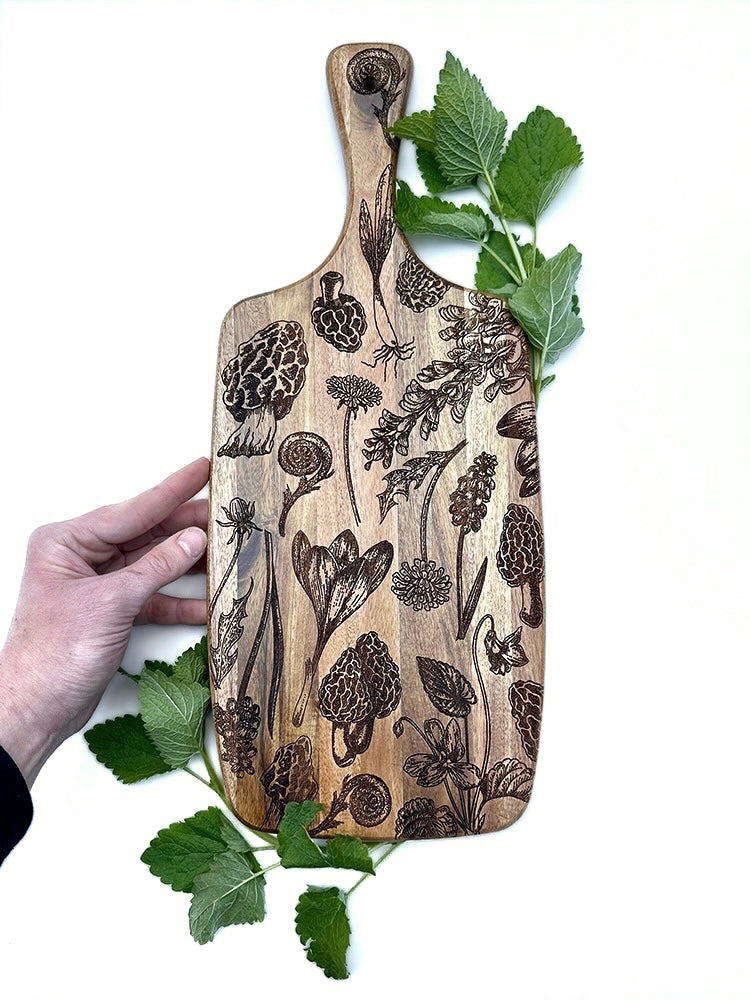 Our foraged plants charcuterie board, which has a full engrave design on the front of the board, will make the perfect serving piece for your next gathering. If needed, the back side can be used as a cutting board, but please wash this piece by hand and oil as necessary. The cutting board is 17" tall, including the handle, and has a hole for easy hanging. This serving board also looks great leaned up against a backsplash to make a true statement in your kitchen.
