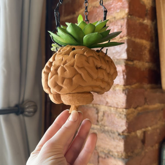 Elevate your plant game with our Hanging Brain Planter. Crafted with 3D printing technology and a clay coloring, this unique planter is sure to make a statement in any room. Perfect for succulents or faux plants, it's the perfect way to add personality and greenery to your space.