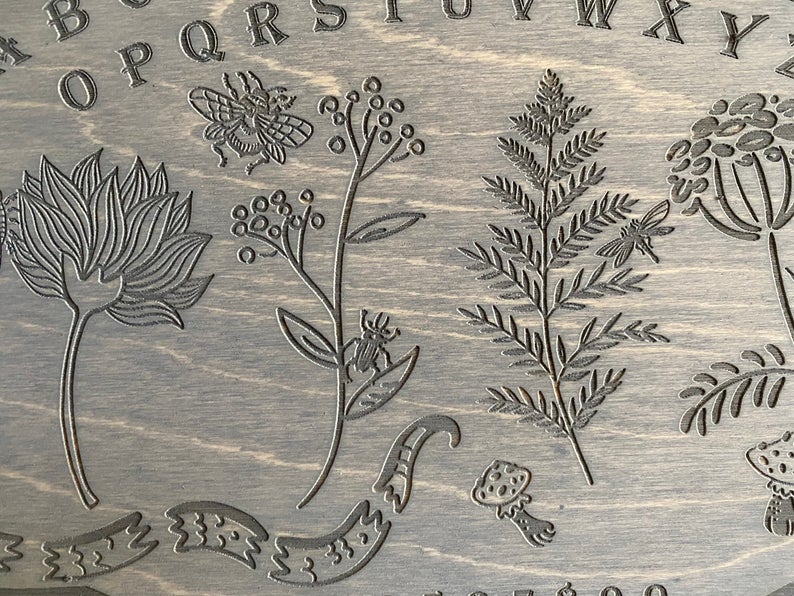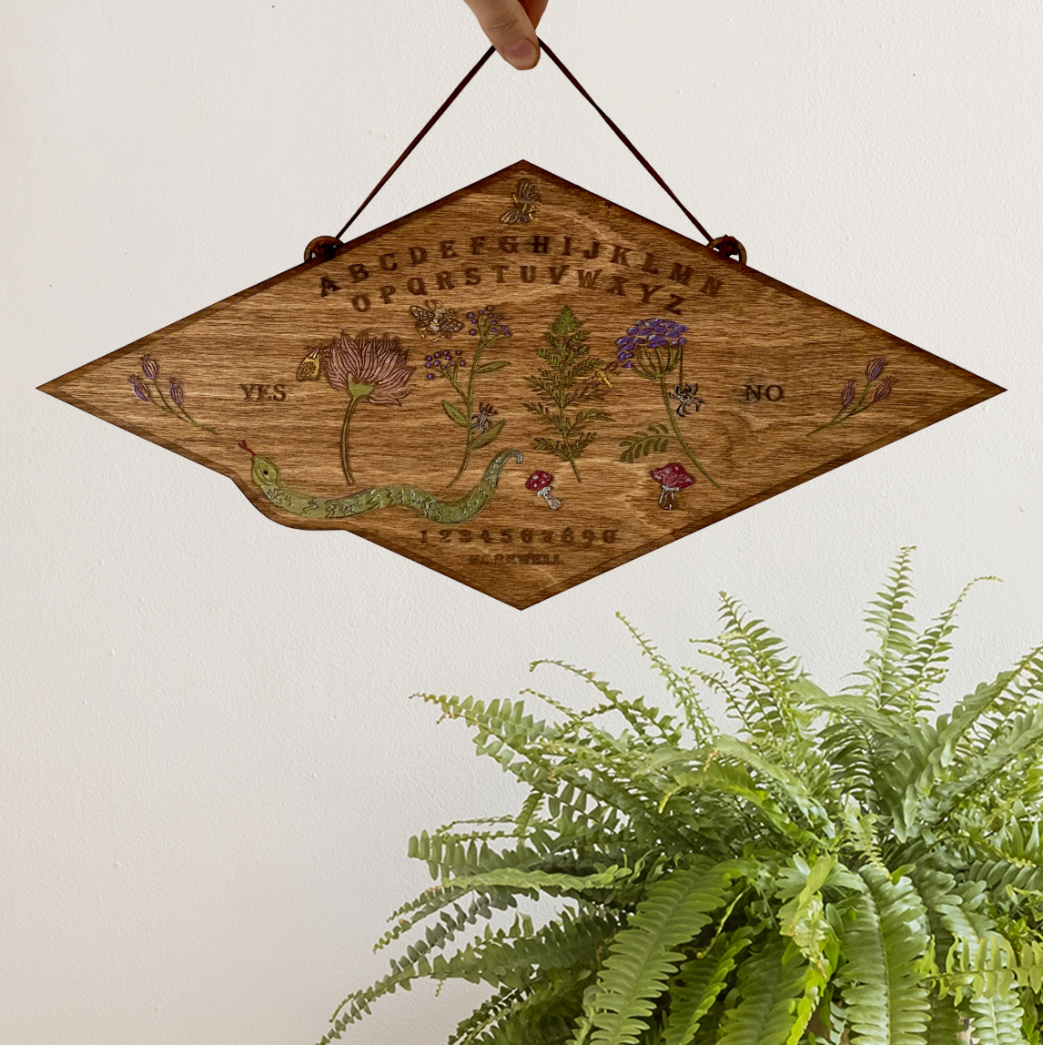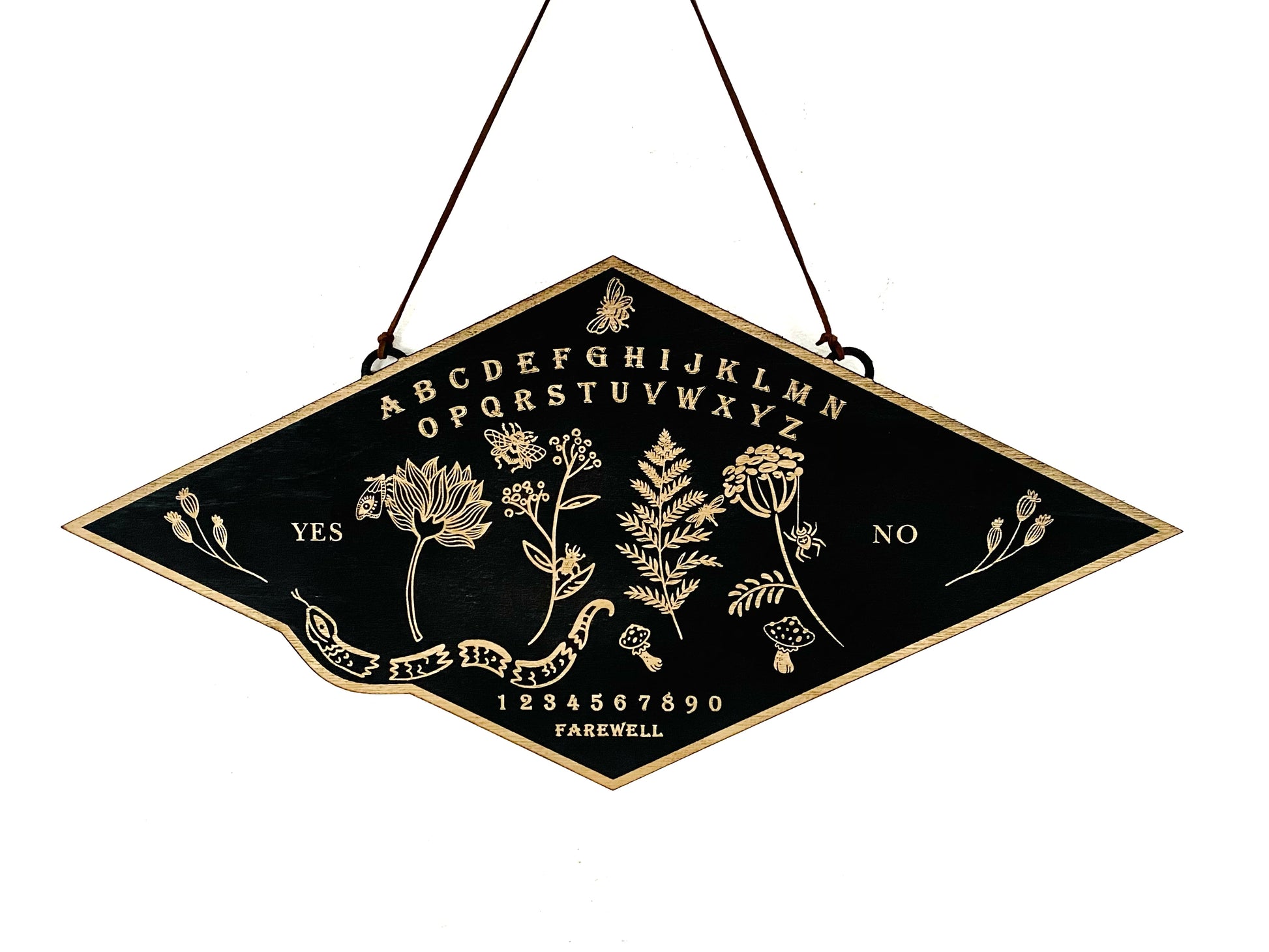 Our specialized Ouija board wall art is the perfect addition to your home, or a gift to give. This is crafted from 1/8th inch birch wood, and has exquisite detailed engravings on the front of the wall art. We also added an antique copper chain for easy hanging.