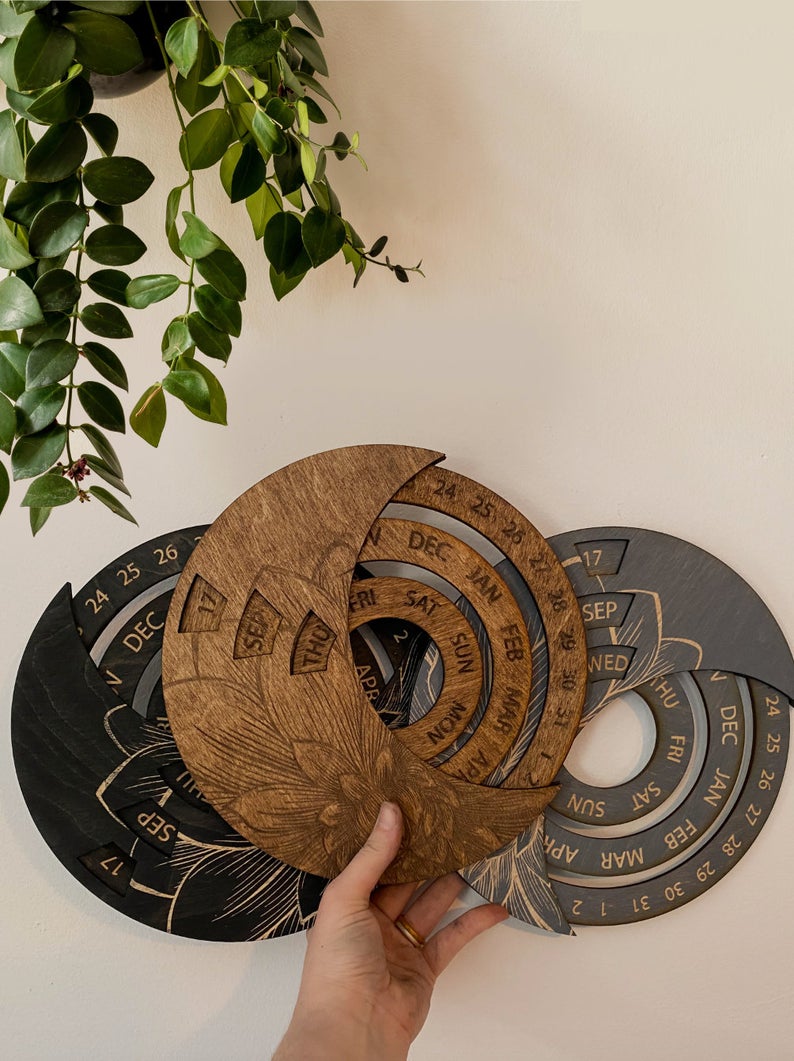 Keeping track of what day it is has never been more fun, and get used to telling all of your friends where you got this calendar because it is just that unique. You will never have to buy another calendar again because of the ease of this sustainable handcrafted piece. There are three layers to the calendar that move to allow you to keep track of the month, day and date. (These do not move on their own. You will have to do that. We test every calendar prior to shipment, but we suggest moving the rings a few times upon receipt to loosen them up.)