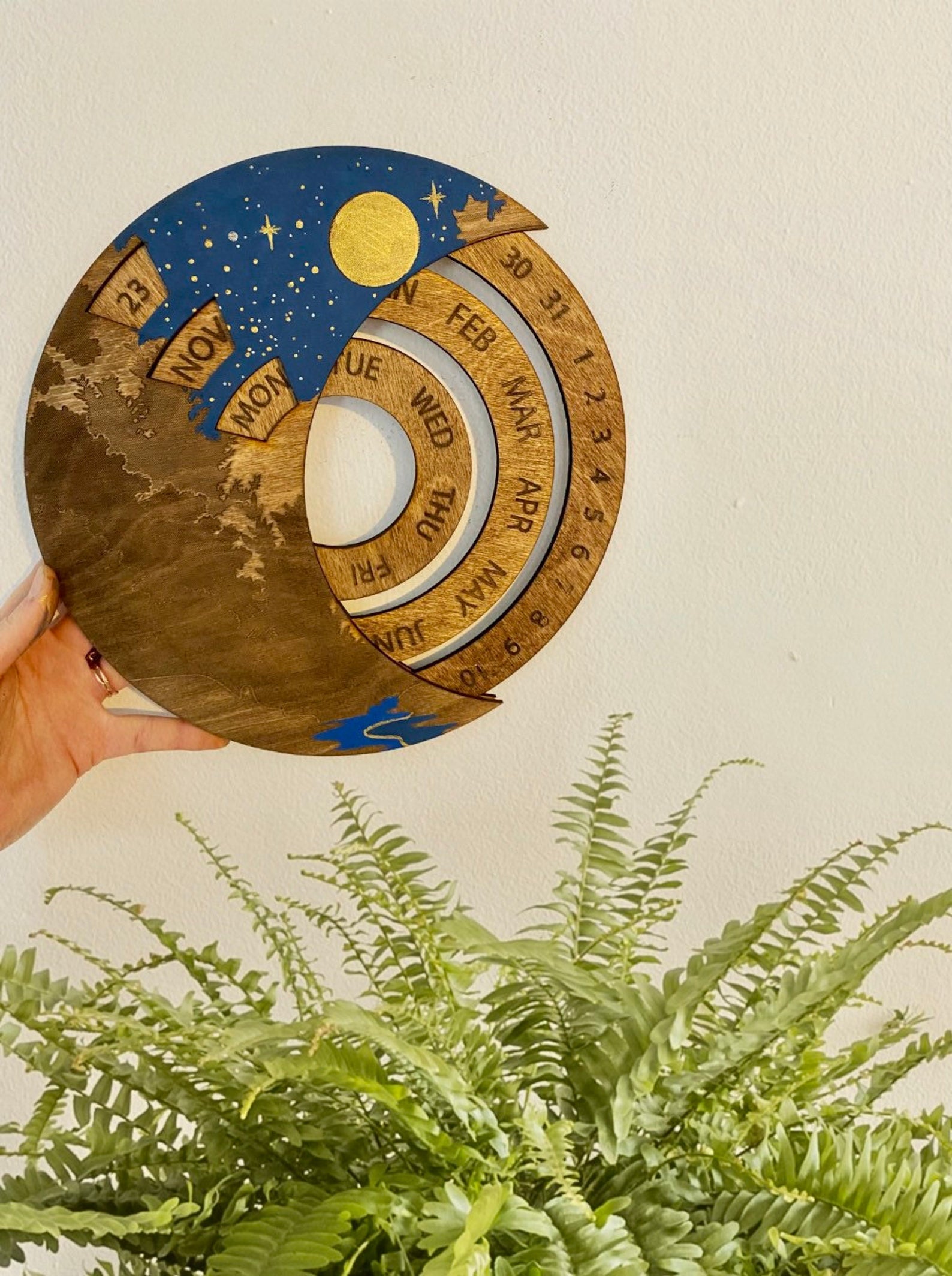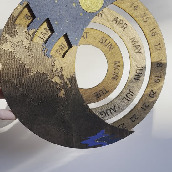 Our hand painted calendars create heirloom pieces since each one is just that unique. You can use this daily, or keep it on a specific date that is important to you. For daily use, you will never have to buy another calendar again because of the ease of this sustainable handcrafted piece. Each calendar has three rings to allow you to keep track of the month, day and date. (These do not move on their own. You will have to do that. We test every calendar prior to shipment, but we suggest moving the rings a few times upon receipt to loosen them up.)