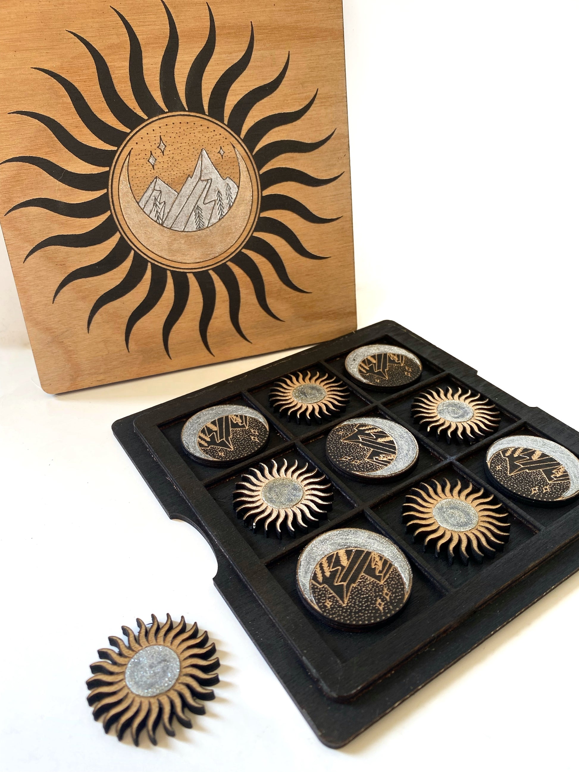 What better way to spend a getaway in a snowy cabin than with this hand painted tic-tac-toe board? We took a classic game and gave it a revamp with our signature distressed style, deep walnut wood, and hand painted accents. This sleek set includes 5 hand painted suns and 5 hand painted moils, which fit inside of the game (we give one extra piece that will not fit).