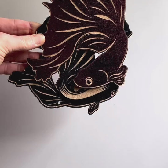 Add a vibrant, playful statement to any room with the stunning Betta Fish Color-Shift Garland. This unique wall hanging features three intricately designed betta fish cut from sturdy 1/8-inch thick birch wood.