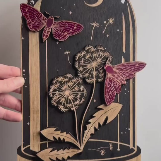 Capture the magic of a twilight garden with the Dandelion Moth Curiosity Dome. This wall hanging features moths in mid-flight framed in the classic dome shape giving it the look of a specimen.