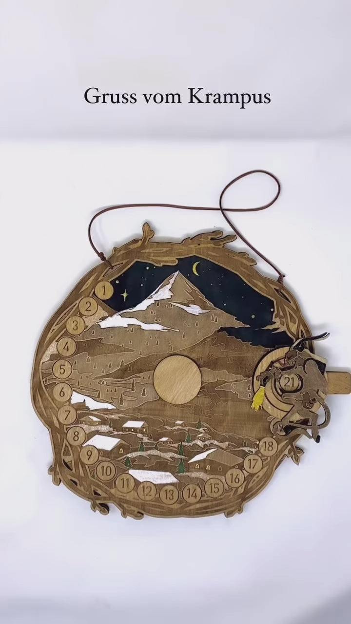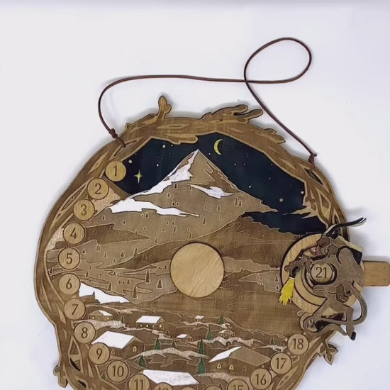 This artisan piece is built for years of enjoyment, crafted from four sturdy, hand-painted and walnut-stained layers of birch wood, totaling a 1/2-inch thickness. The intricate design features an engraved mountain scape that sets a magical scene as you manually move the Krampus day-marker along the track. Available in both a 21-day or 25-day countdown range, this unique calendar comes ready to hang with a vegan cord and makes a thoughtful, unconventional holiday gift.