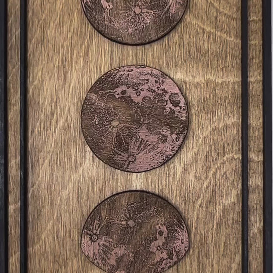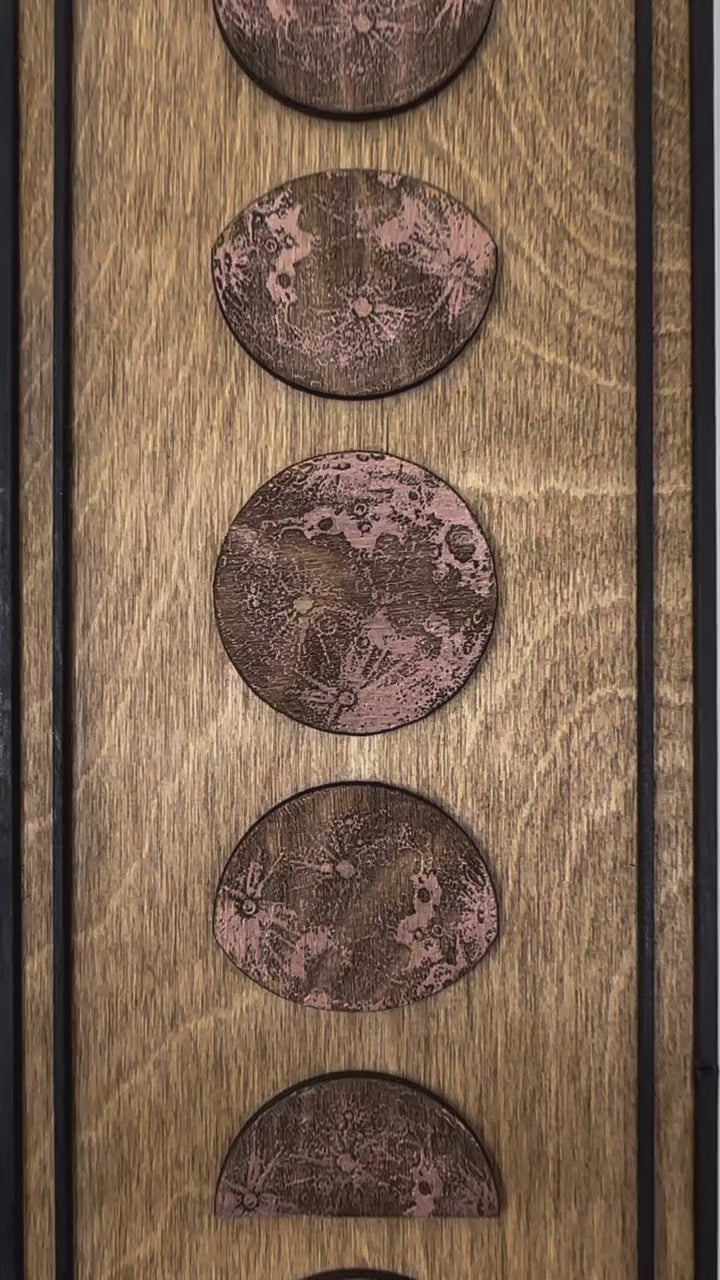 If you are looking for a new gallery wall piece that will make a statement, you found it with our Phases of the Moon Wall Hanging. Its size of 18.5" tall will make a stunning addition to your curated gallery wall. We offer this in two colorways: Black with Gold accents and Walnut with Rose Gold accents.